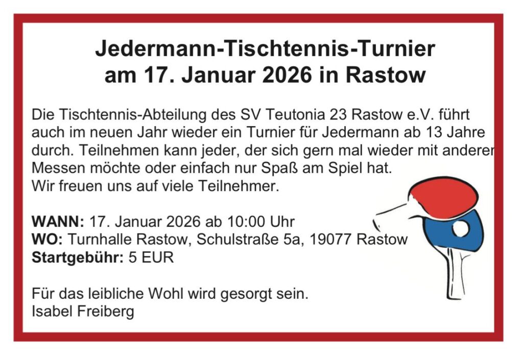 „Das war ein toller winterlicher Start ins neue Jahr!“ freute sich das Organisationsteam des 12. Rastower Neujahrslaufes, der am 4.Januar nicht nur für Vereinsmitglieder stattfand. Der SV Teutonia 23 Rastow e.V. hatte eingeladen und Sportbegeisterte aus 20 Gemeinden, von Wittenburg bis Schwerin, folgten der Einladung.